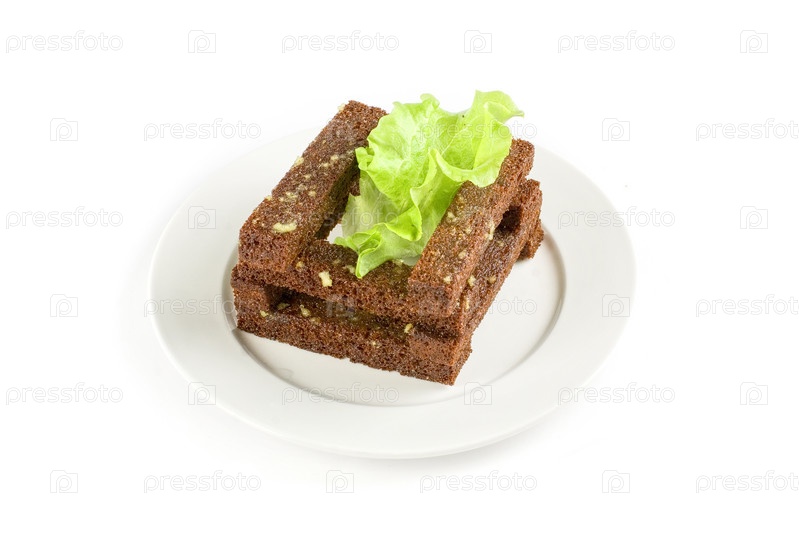 Поджаренный хлеб с чесноком и листья салата, на белом фоне