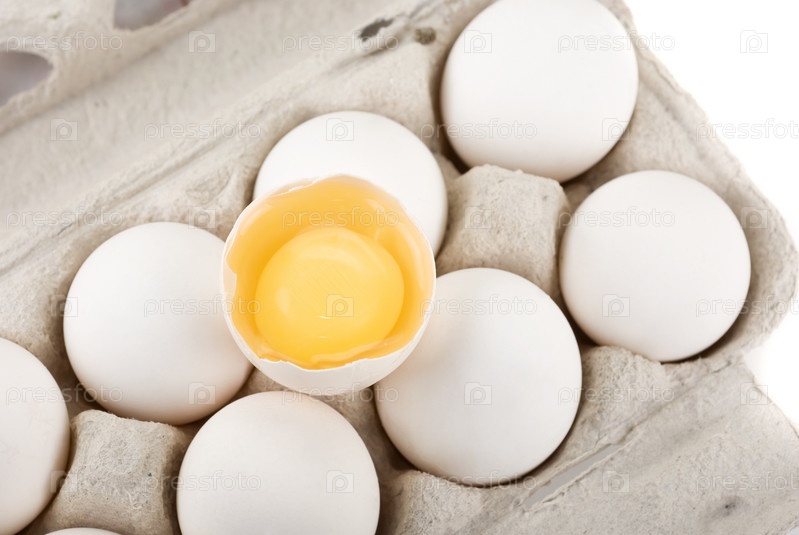 Разбитое яйцо среди целых яиц в коробке на белом фоне