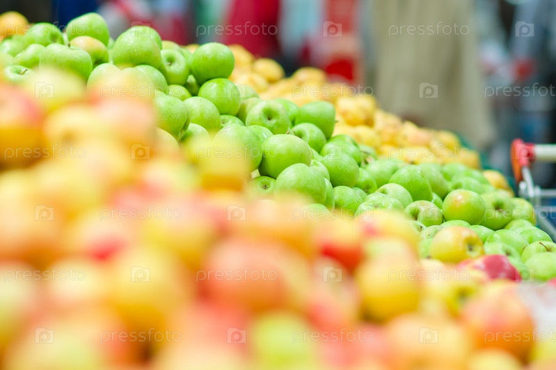 Куча свежих зеленых яблок в коробках в супермаркете