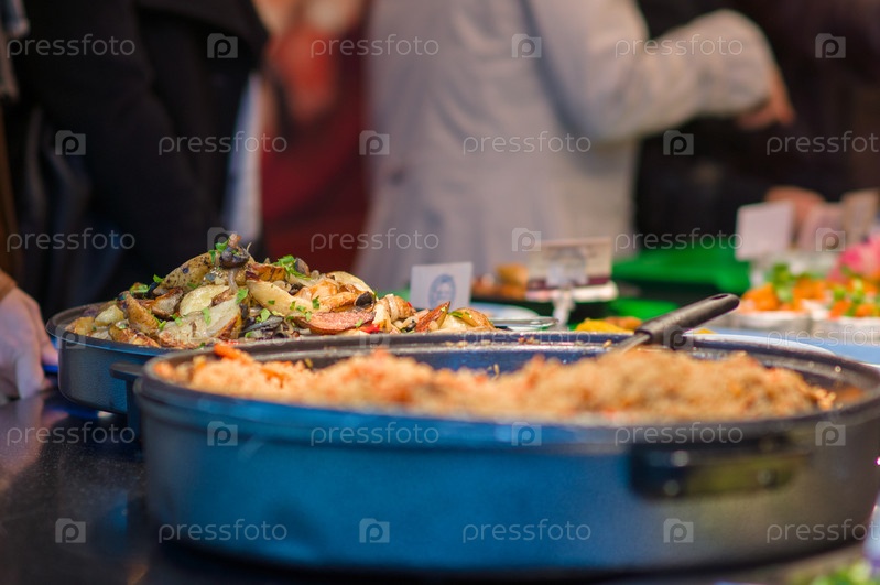 Салаты и другие блюда с овощами и мясом на стол в ресторане