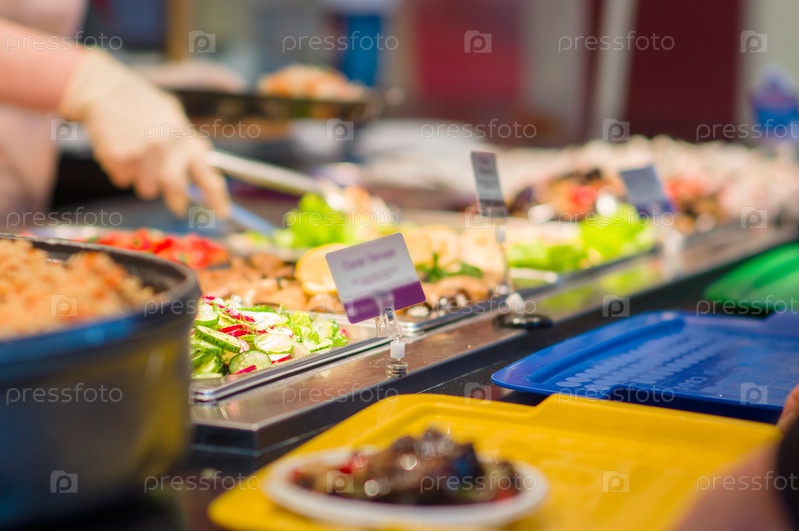 Салаты и другие блюда с овощами и мясом на стол в ресторане
