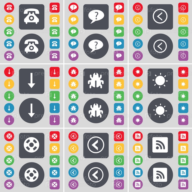 Ретро телефон, пузырь чата, стрелка слева, стрелка вниз, ошибка, свет, видеозапись, стрелка влево, значок символа RSS. Большой набор плоских цветных кнопок для вашего дизайна. вектор