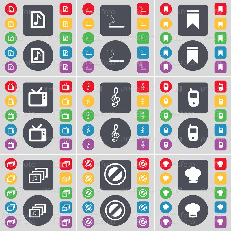 Музыкальный файл, сигареты, маркер, Ретро ТВ, скрипичный ключ, мобильный телефон, галерея, стоп, приготовление шляпа значок символ. Большой набор плоских, цветные кнопки для вашего дизайна. Вектор