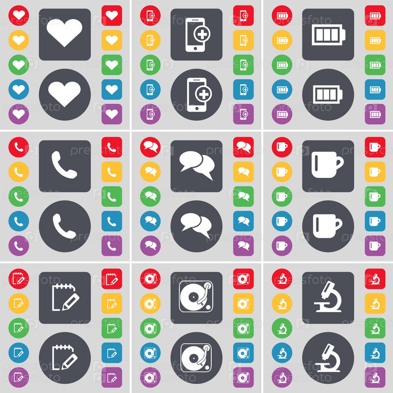 Сердце, смартфон, батарея, приемник, чат, Кубок, обследования, граммофон, Микроскоп значок символа. Большой набор плоских, цветные кнопки для вашего дизайна. Вектор