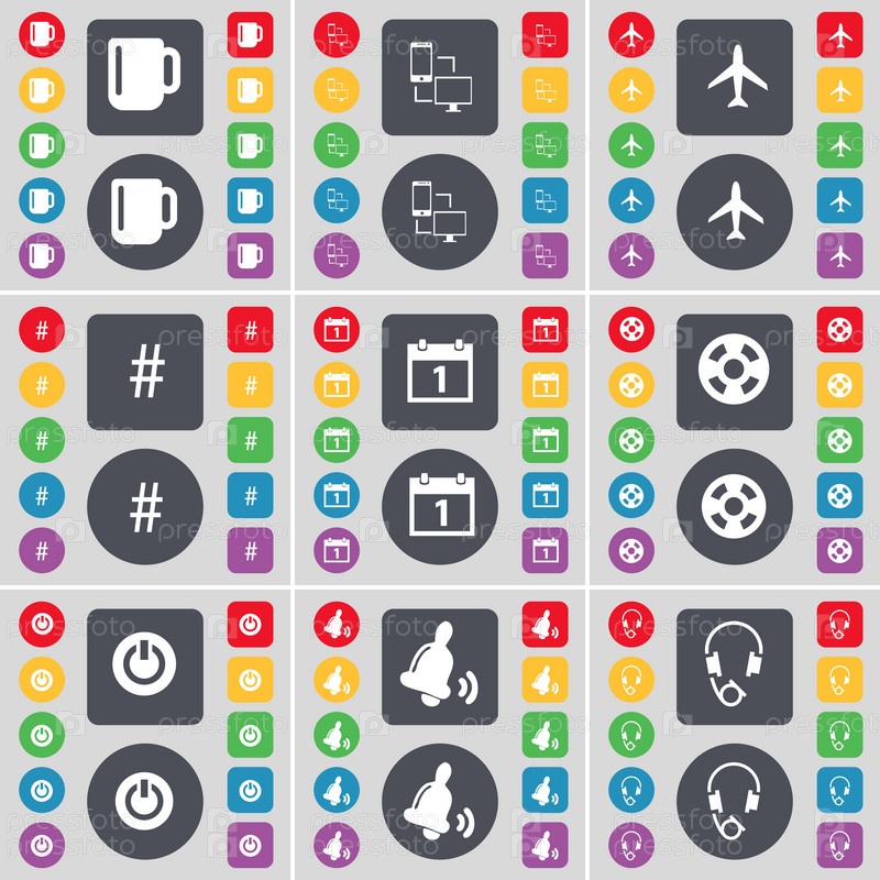 Чашка, связь, ёлка, хэштег, календарь, видеозапись, мощность, колокол, символ значка наушников. большой набор плоских цветных кнопок для вашего дизайна. вектор