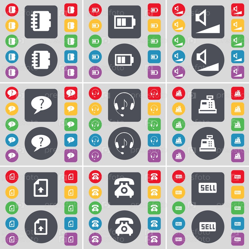 Ноутбук, батарея, объем, чат пузырь, наушники, наличные регистра, файл, ретро телефон, продать значок символа. Большой набор плоских, цветные кнопки для вашего дизайна. Вектор