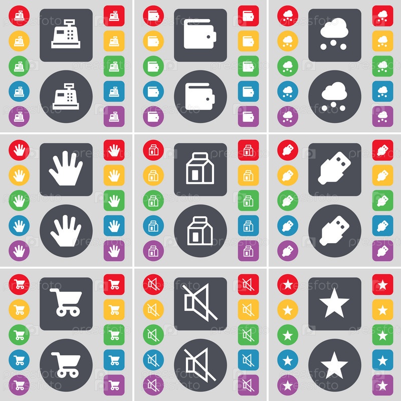 Денежные средства, кошелек, облако, рука, упаковка, USB-накопитель, корзина, немой, звезда иконный символ. большой набор плоских цветных кнопок для вашего дизайна. вектор