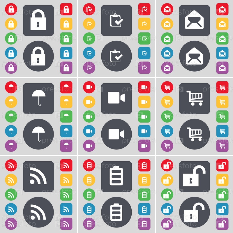 Замок, обследование, сообщение, зонтик, пленочная камера, корзина, RSS, аккумулятор, символ иконки замка. большой набор плоских цветных кнопок для вашего дизайна. вектор