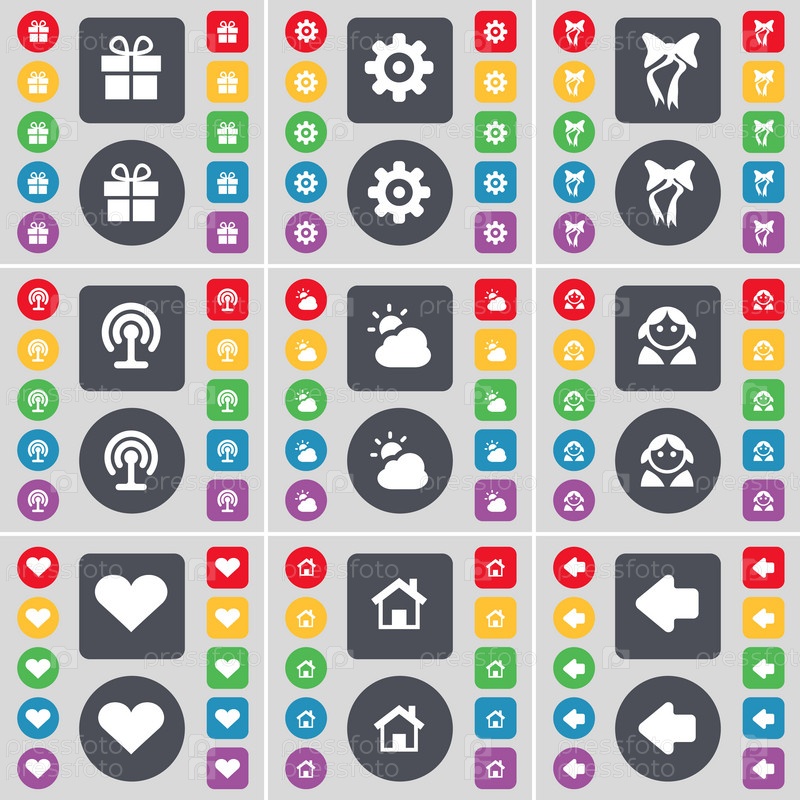 Подарок, снаряжение, лук, Wi-Fi, облако, аватар, сердце, дом, стрелка слева от значка символа.Большой набор плоских цветных кнопок для вашего дизайна.Вектор