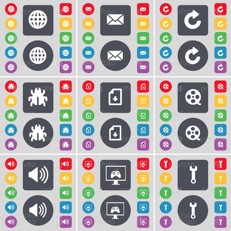 Глобус, сообщение, перезагрузка, ошибка, файл, видеозапись, звук, монитор, символ значок гаечного ключа. Большой набор плоских, цветные кнопки для вашего дизайна. Вектор
