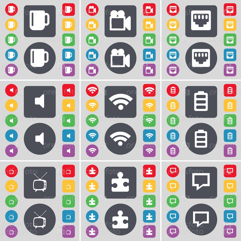 Чашка, пленочная камера, сокет LAN, звук, Wi-Fi, батарея, Ретро ТВ, часть головоломки, чат пузырь значок символа. Большой набор плоских цветных кнопок для вашего дизайна. вектор