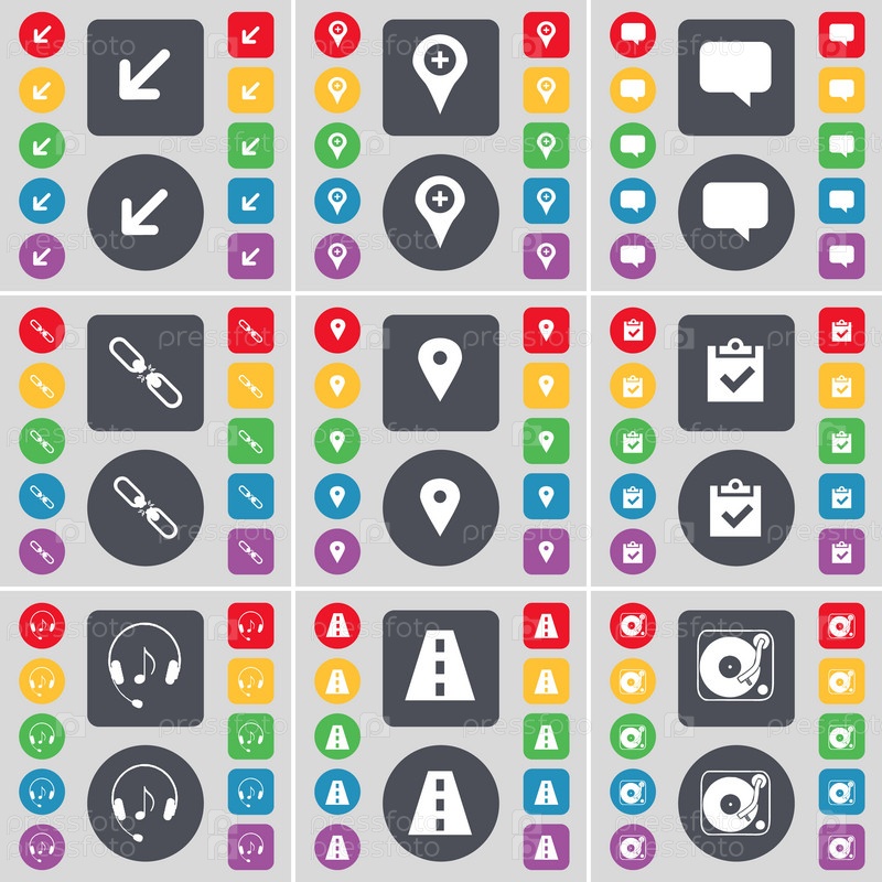 Развертывание экран, контрольно-пропускной пункт, чат пузырь, ссылка, обследования, наушники, дорога, граммофон значок символа. Большой набор плоских, цветные кнопки для вашего дизайна. Вектор