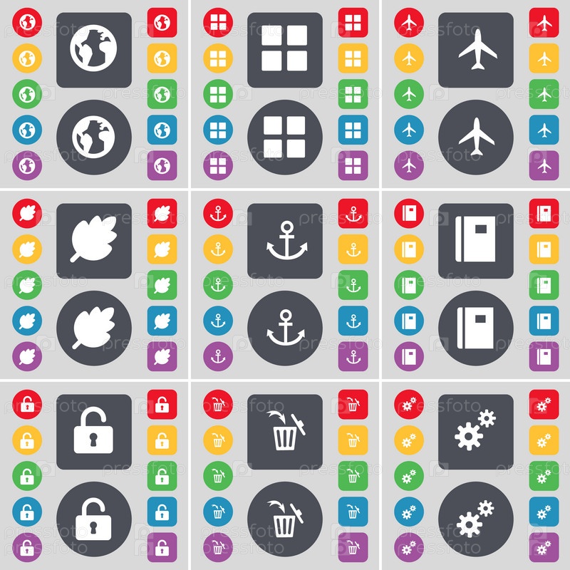 Земля, приложения, самолет, лист, якорь, ноутбук, замок, мусор может передавать значок символа. большой набор плоских цветных кнопок для вашего дизайна. вектор