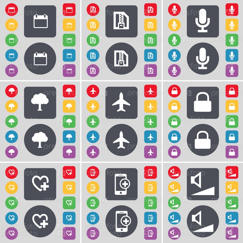 Календарь, ZIP-файл, микрофон, дерево, самолет, замок, сердце, смартфон, значок символа тома. Большой набор плоских цветных кнопок для вашего дизайна. вектор