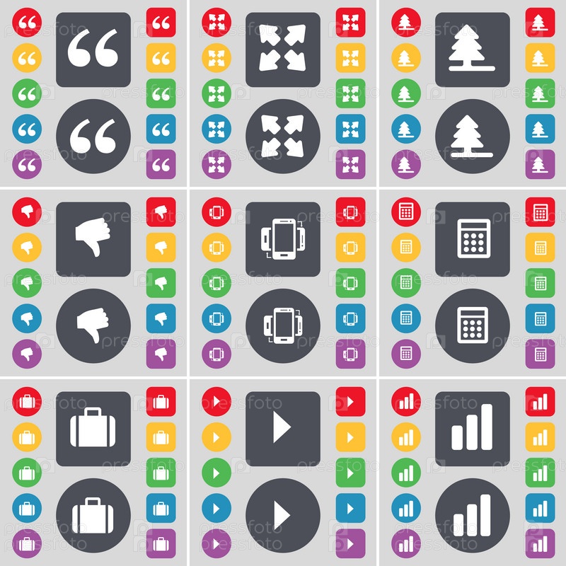 Кавычки, полный экран, елочка, неприязнь, смартфон, калькулятор, чемодан, средства массовой информации играют, диаграмма значок символа. Большой набор плоских, цветные кнопки для вашего дизайна. Вектор
