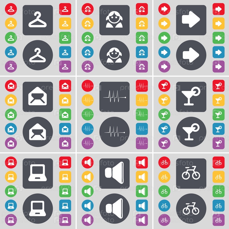 Хагер, аватар, стрелка вправо, сообщение, пульс, коктейль, ноутбук, звук, велосипедов значок символа. Большой набор плоских, цветные кнопки для вашего дизайна. Вектор