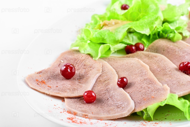 Говяжий язык с клюквой, зеленым салатом и горчицей