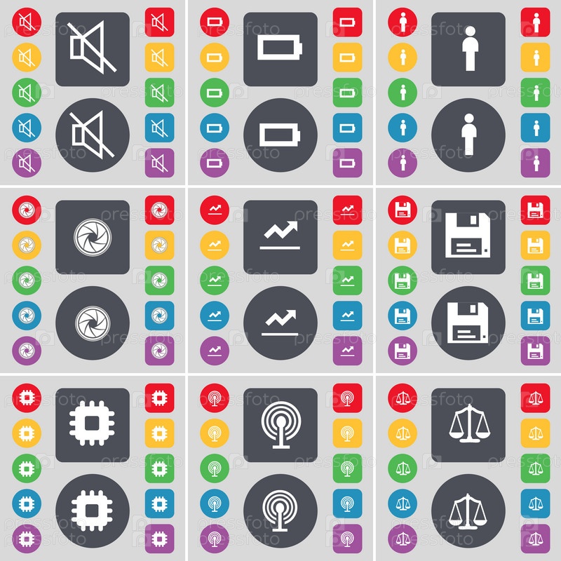 Безмолвие, батарея, силуэт, объектив, граф, флоппи, процессор, Wi-Fi, вес иконки символа.Большой набор плоских цветных кнопок для вашего дизайна.Вектор