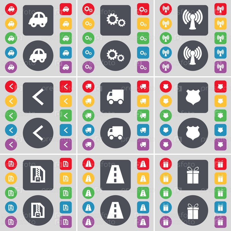 Автомобиль, оборудование, Wi-Fi, стрелка слева, грузовик, полицейский значок, почтовые карточки, дороги, значок символа Gift. Большой набор плоских цветных кнопок для вашего дизайна. вектор