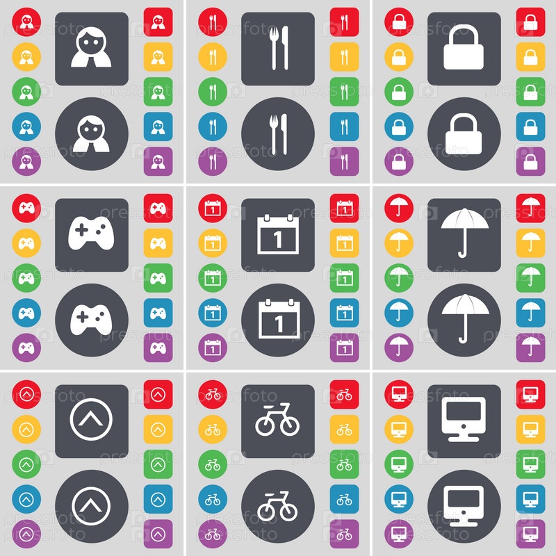 Аватар, вилка и нож, замок, геймпад, календарь, зонтик, стрелка вверх, велосипедов, монитор значок символа. Большой набор плоских, цветные кнопки для вашего дизайна. Вектор