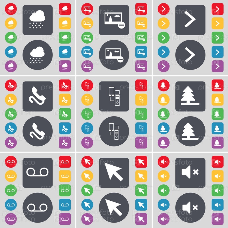Облако, фотография, стрелка направо, приемник, связь, елка, кассеты, курсор, иконка символов Mute. Большой набор плоских цветных кнопок для вашего дизайна. вектор