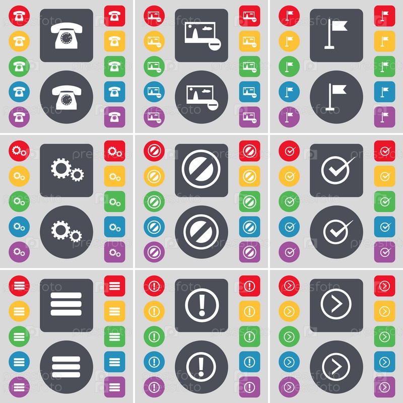 Ретро телефон, фотография, отверстие для гольфа, редуктор, остановка, тик, приложения, информация, стрелка вправо иконки символа. большой набор плоских цветных кнопок для вашего дизайна. вектор
