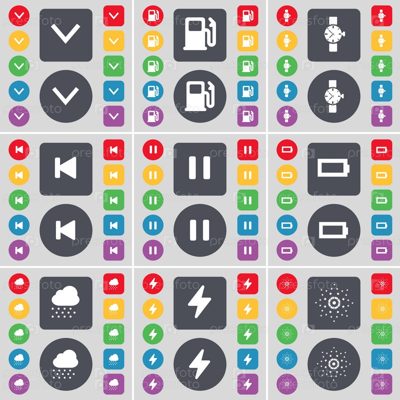 Стрелка вниз, заправочная станция, наручные часы, скип медиа, пауза, батарея, Cloudd, флэш, символ значка звезды. Большой набор плоских цветных кнопок для вашего дизайна. вектор