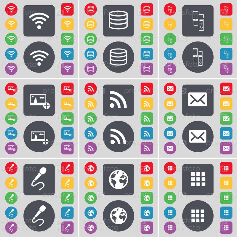 Wi-Fi, базы данных, подключение, фотография, RSS, сообщение, микрофон, земля, символ иконки приложения. большой набор плоских цветных кнопок для вашего дизайна. вектор