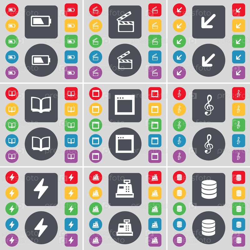 Аккумулятор, клаппер, развертывающий экран, книга, окна, скрипичный ключ, Флэш, денежный реестр, базы данных значок символа. Большой набор плоских цветных кнопок для вашего дизайна. вектор