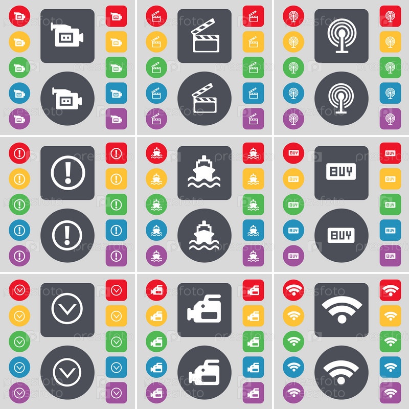 Кинокамера, клаппер, Wi-Fi, восклицательный знак, корабль, Купить, стрелка вниз значок символа. Большой набор плоских цветных кнопок для вашего дизайна. вектор