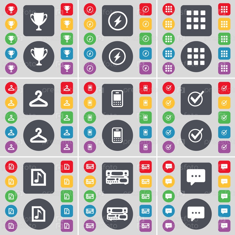 Кубок, Флэш, Приложения, вешалка, мобильный телефон, тик-такс, музыкальный файл, проигрыватель, иконка символа чата.Большой набор плоских цветных кнопок для вашего дизайна.Вектор