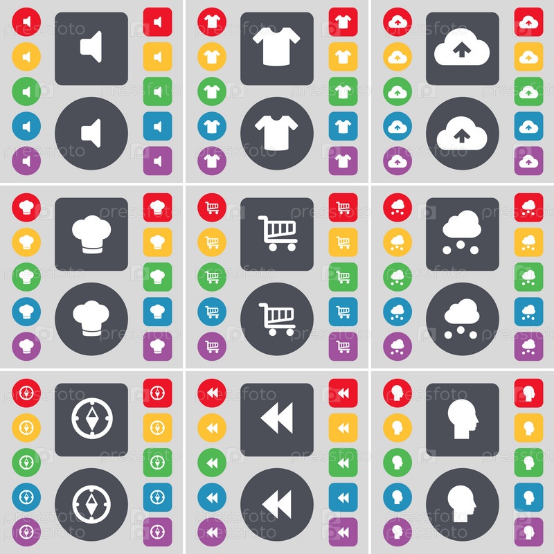 Звук, футболку, облако, приготовление шляпу, корзина, облако, компас, перемотка, силуэт значок символа. Большой набор плоских, цветные кнопки для вашего дизайна. Вектор
