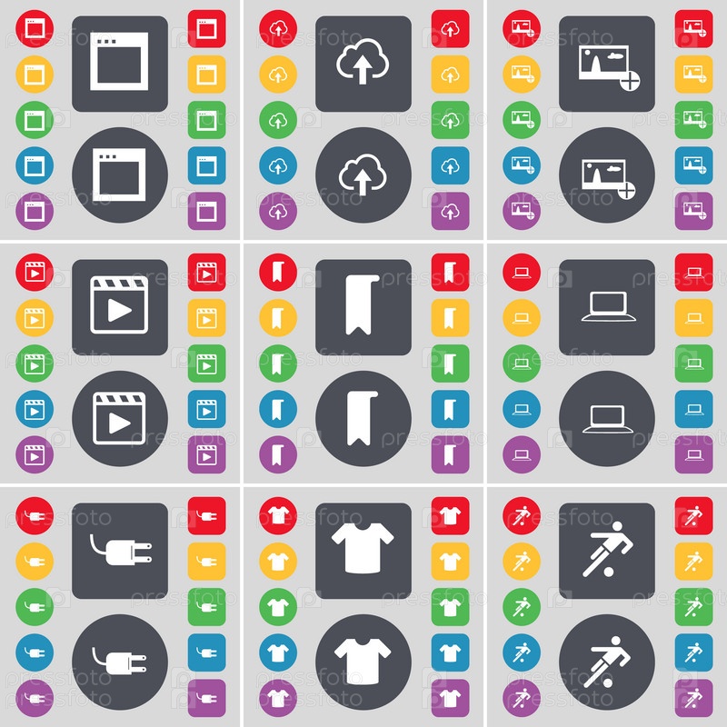 Окна, облако, фотография, Клаппер, маркер, ноутбук, розетка, футболку, силуэт значок символа. Большой набор плоских, цветные кнопки для вашего дизайна. Вектор