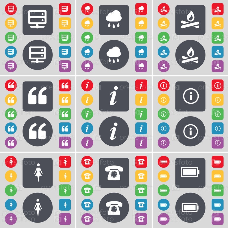 Сервера, облако, костра, кавычки, информация, силуэт, ретро телефон, значок символ батареи. Большой набор плоских, цветные кнопки для вашего дизайна. Вектор