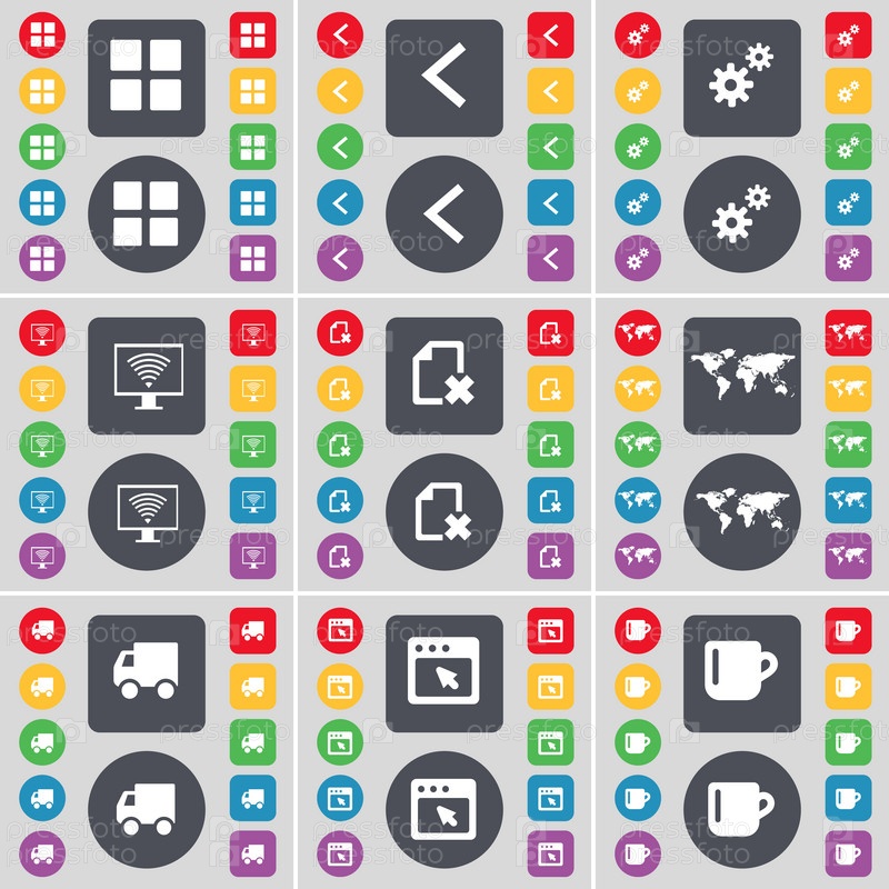 Приложения, стрелка слева, оборудование, монитор, файл, глобус, грузовик, окно, кубок иконки символа. большой набор плоских цветных кнопок для вашего дизайна. вектор