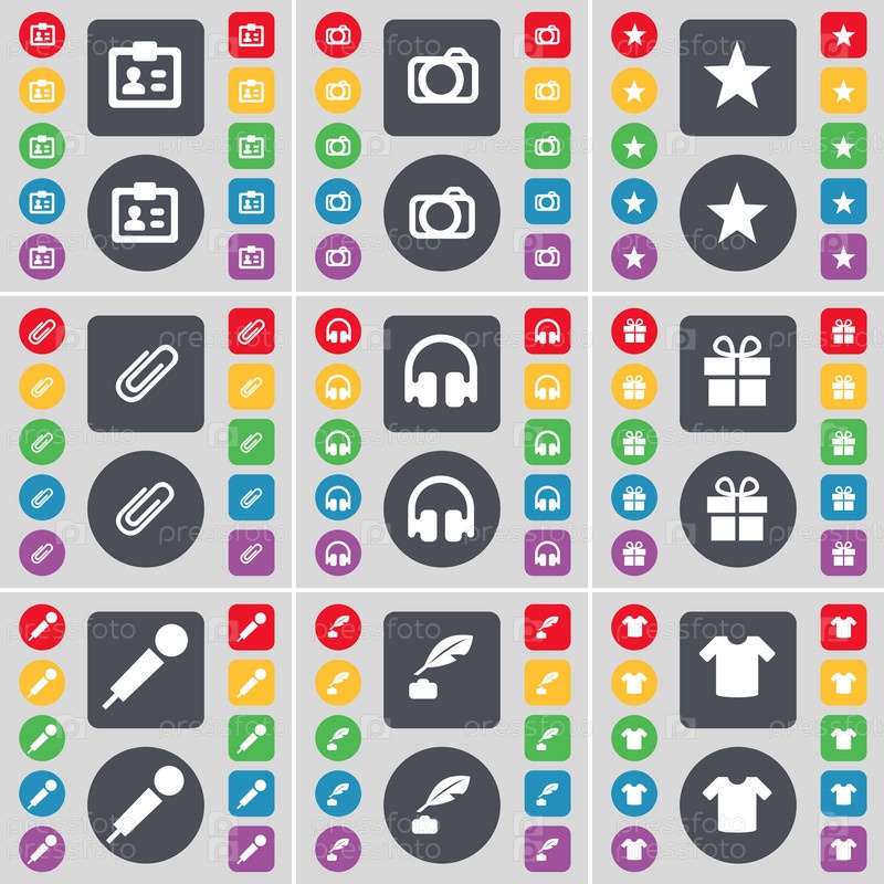 Контакт, камеры, звезда, клип, наушники, подарок, микрофон, чернильница, футболке значок символа. Большой набор плоских, цветные кнопки для вашего дизайна. Вектор