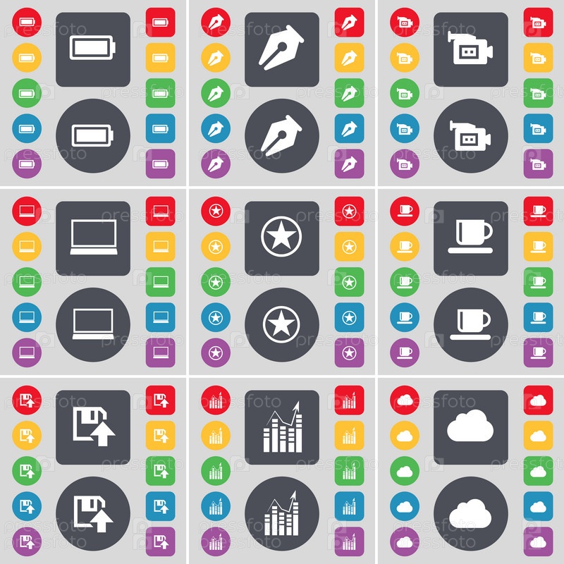 Батарея, чернила перо, пленочной камеры, ноутбук, звезда, Кубок, флоппи, граф, Облако значок символа. Большой набор плоских, цветные кнопки для вашего дизайна. Вектор