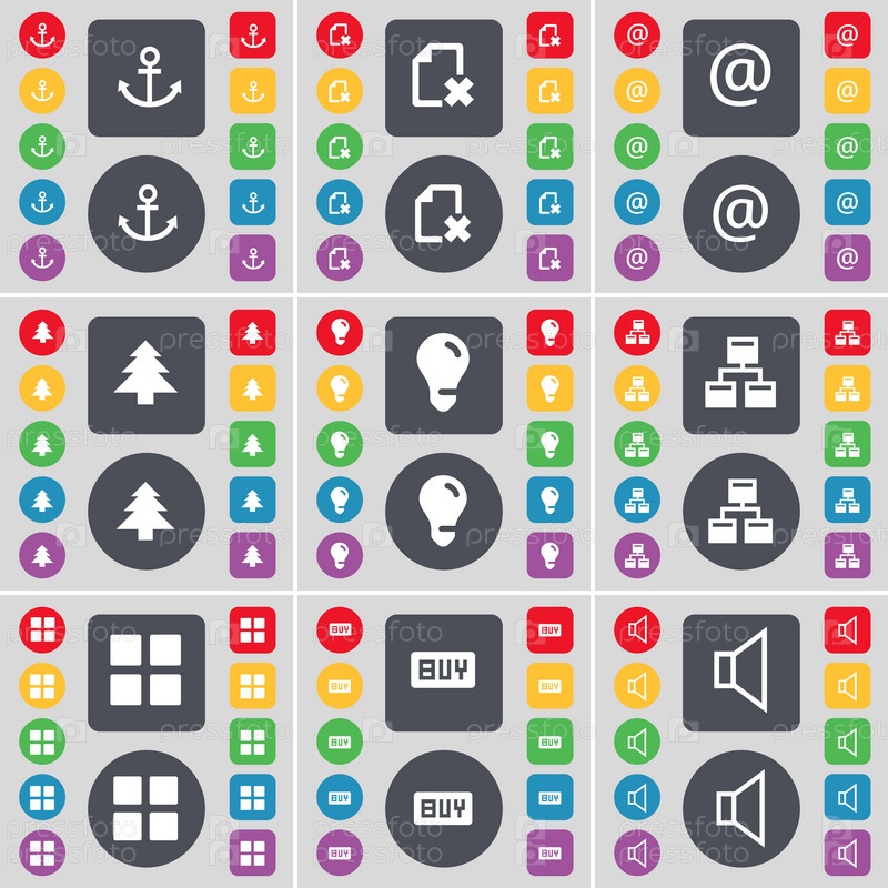 Якорь, файлы, почта, ёлка, лампочки, сеть, приложения, покупка, значок звукового символа. большой набор плоских цветных кнопок для вашего дизайна. вектор