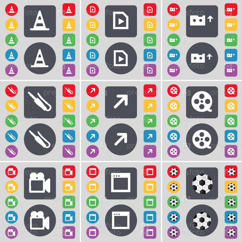Конус, файл мультимедиа, кассеты, разъем для микрофона, полный экран, видеозапись, фильм камеры, окна, мяч значок символа. Большой набор плоских, цветные кнопки для вашего дизайна. Вектор