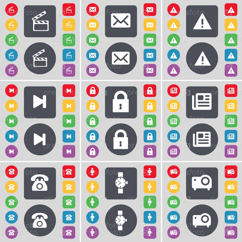 Клаппер, сообщения, предупреждения, пропустить СМИ, замок, газета, ретро телефон, наручные часы, проектор значок символа. Большой набор плоских, цветные кнопки для вашего дизайна. Вектор