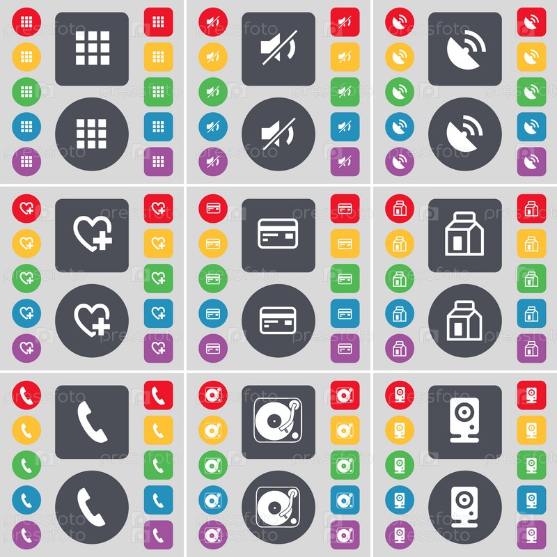 Приложения, Мутный звук, Спутниковая тарелка, сердце, кредитная карта, упаковка, приемник, граммофон, Спикер Икона символа. Большой набор плоских цветных кнопок для вашего дизайна. Вектор