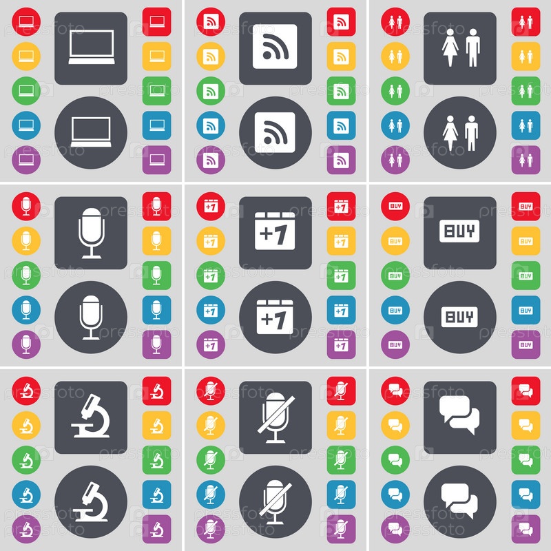 Ноутбук, RSS, силуэт, микрофон, плюс один, Купить, Микроскоп, значок символа чата. Большой набор плоских цветных кнопок для вашего дизайна. Вектор