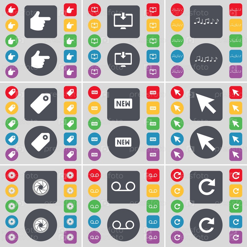Рука, монитор, Примечание, тег, новая, курсора, объектив, кассетный, перезагрузить значок символа. Большой набор плоских, цветные кнопки для вашего дизайна. Вектор