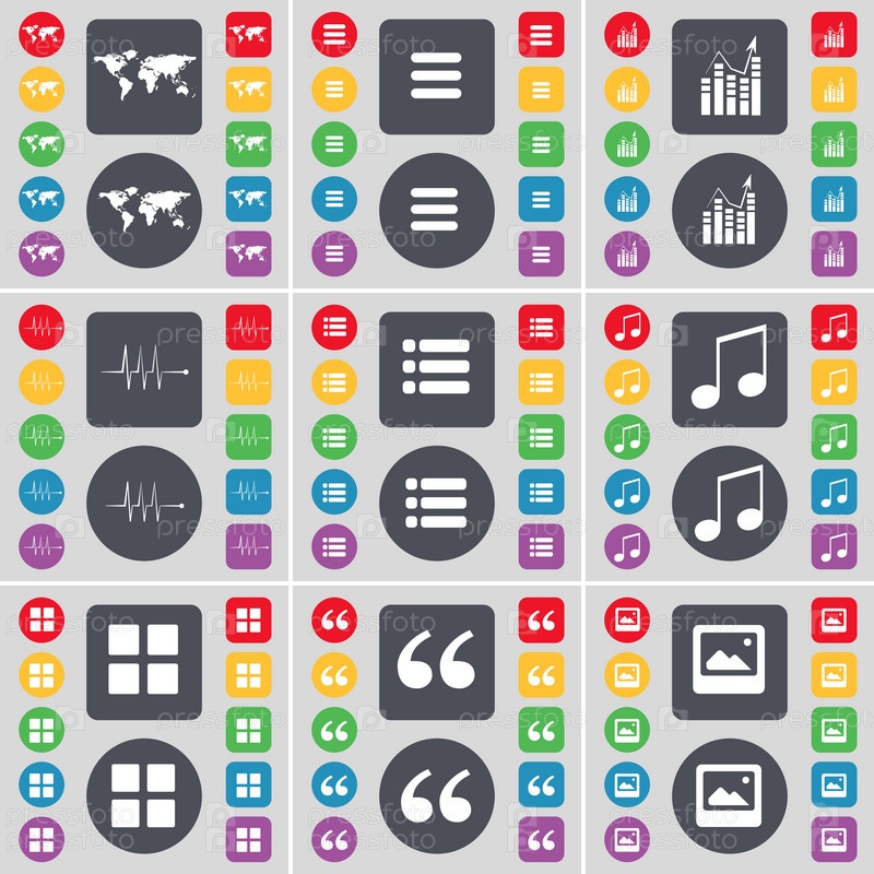 Глобус, приложения, граф, пульс, список, примечание, запятые, окна иконки символа. большой набор плоских цветных кнопок для вашего дизайна. вектор