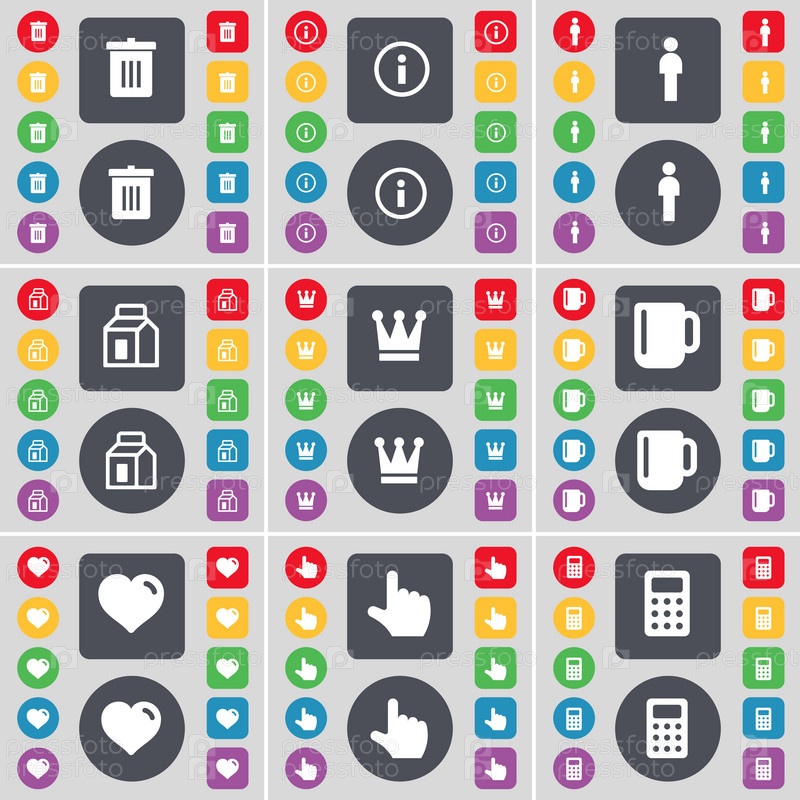 Мусорный бак, информация, силуэт, упаковка, Корона, Кубок, сердце, руки, калькулятор значок символа. Большой набор плоских, цветные кнопки для вашего дизайна. Вектор