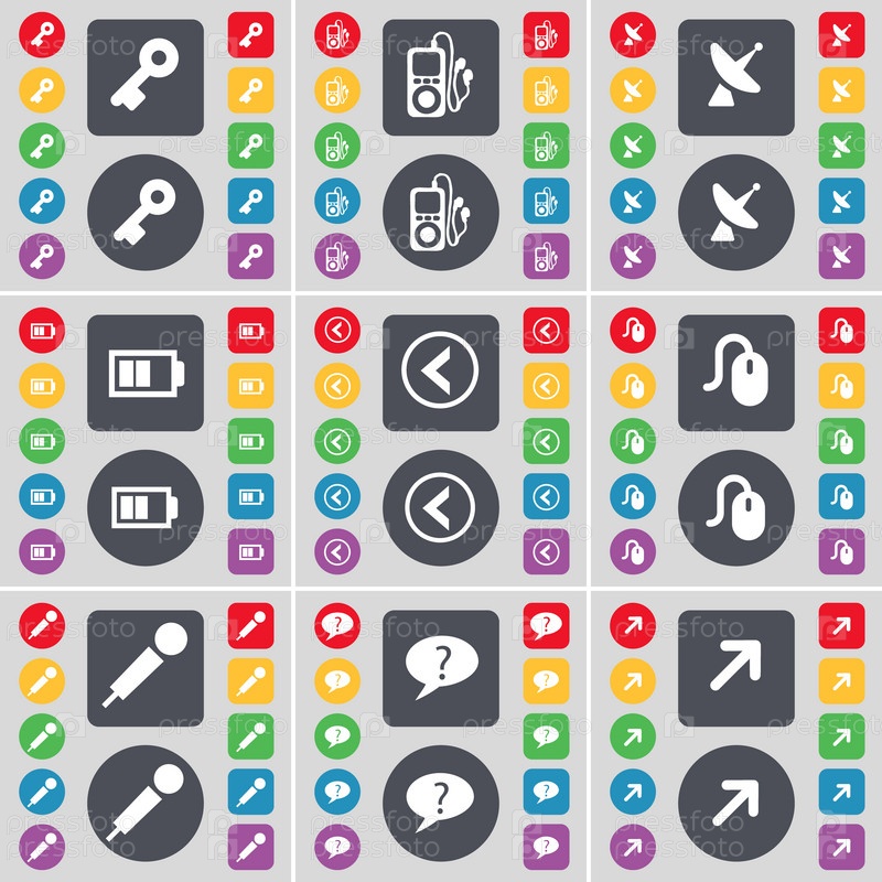Ключ, MP3-плеер, Спутниковая тарелка, аккумулятор, стрелка слева, мышь, микрофон, пузырь чата, полноэкранный значок символа. Большой набор плоских цветных кнопок для вашего дизайна