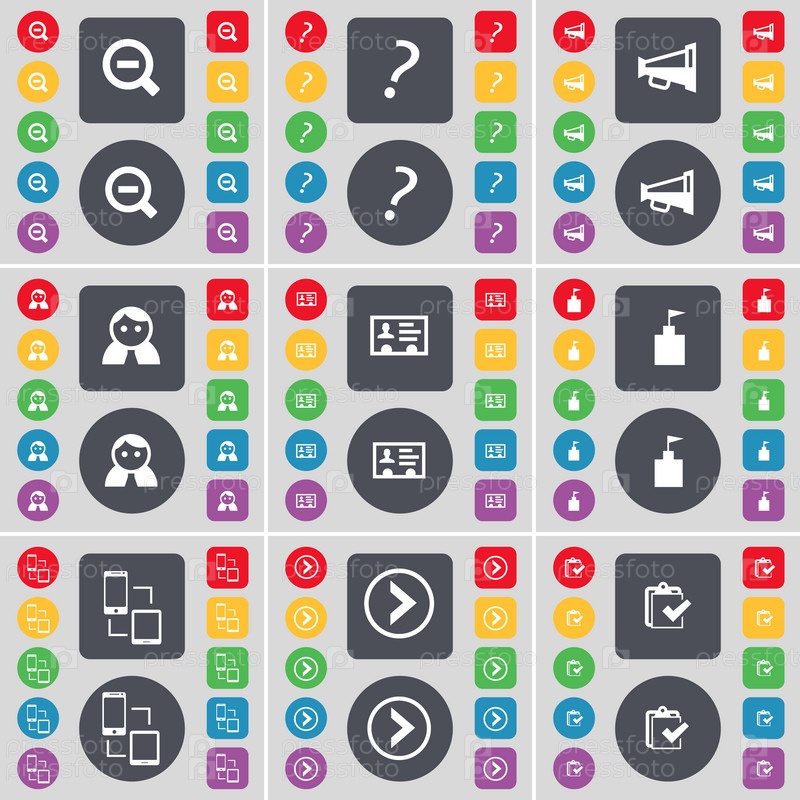 Увеличительное стекло, вопросительный знак, Мегафон, аватар, контакт, флаг башня, связи, стрелка вправо, обследования значок символа. Большой набор плоских, цветные кнопки для вашего дизайна. Вектор