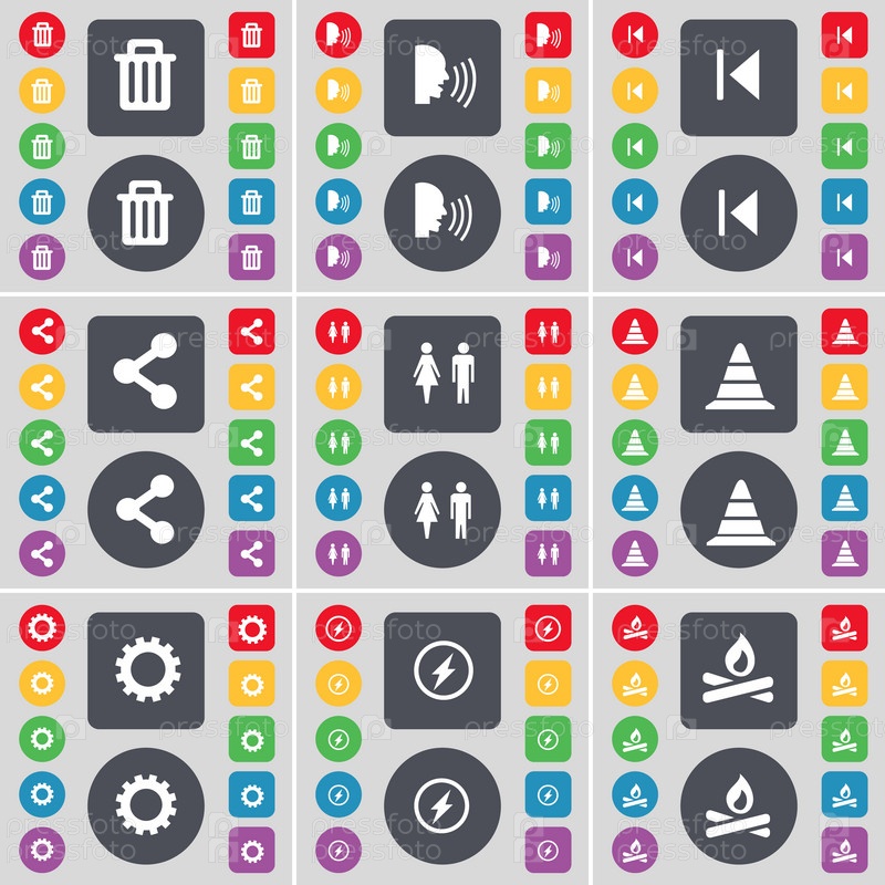 Мусорный бак, пропускать разговор, СМИ, доля, силуэт, конус, Флэш, иконка горящего колеса.Большой набор плоских цветных кнопок для вашего дизайна.Вектор