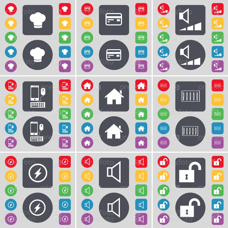 Приготовление шляпы, кредитные карты, объем, смартфон, дом, эквалайзер, Флэш, звук, символ икон замка. большой набор плоских цветных кнопок для вашего дизайна. вектор