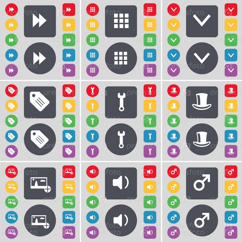 Свернуть назад, приложения, стрелка вниз, тег, гейковерт, шелковая шляпа, изображение, звук, марсианский символ символа. большой набор плоских цветных кнопок для вашего дизайна. вектор